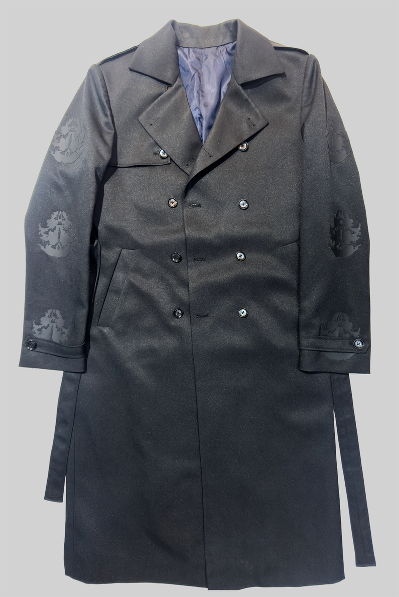 Black Twill Trench Coat; FABRIC- Cotton polyester twill blend, with heat transfer on sleeves